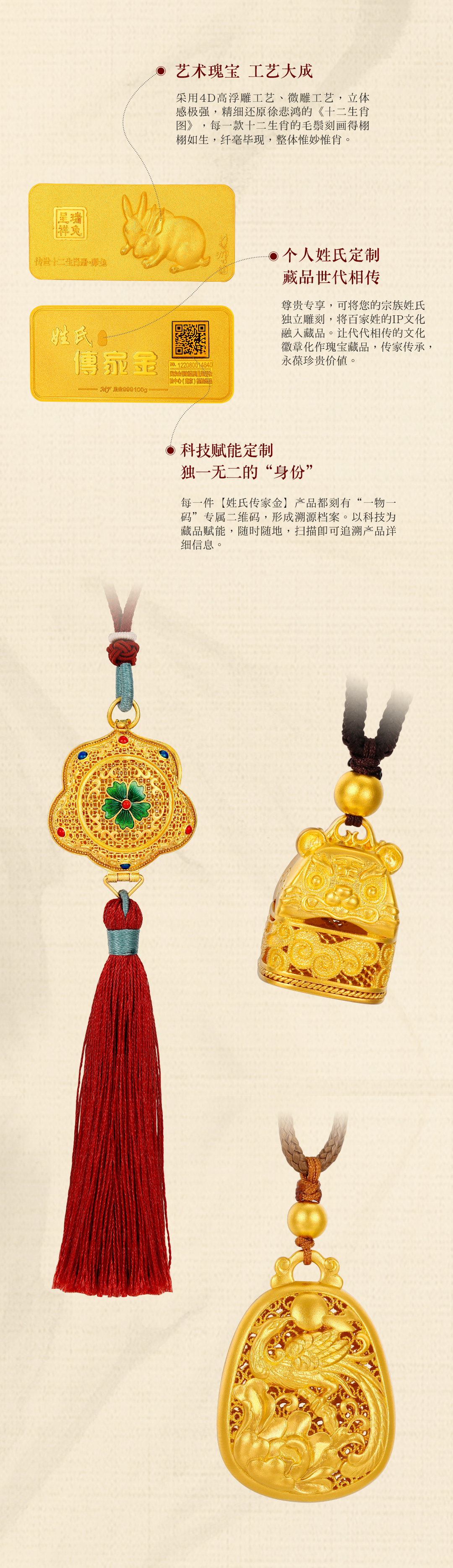 明豐珠寶【姓氏傳家金】系列,以國畫泰斗徐悲鴻的《十二生肖圖》為主題設(shè)計(jì),運(yùn)用浮雕高度最高,立體感更強(qiáng)的第三代4D立體高浮雕、微雕工藝將十二生肖刻畫得纖毫畢現(xiàn),惟妙惟肖,精妙還原了響徹世界的國畫瑰寶,傳家傳世,價(jià)值非凡。